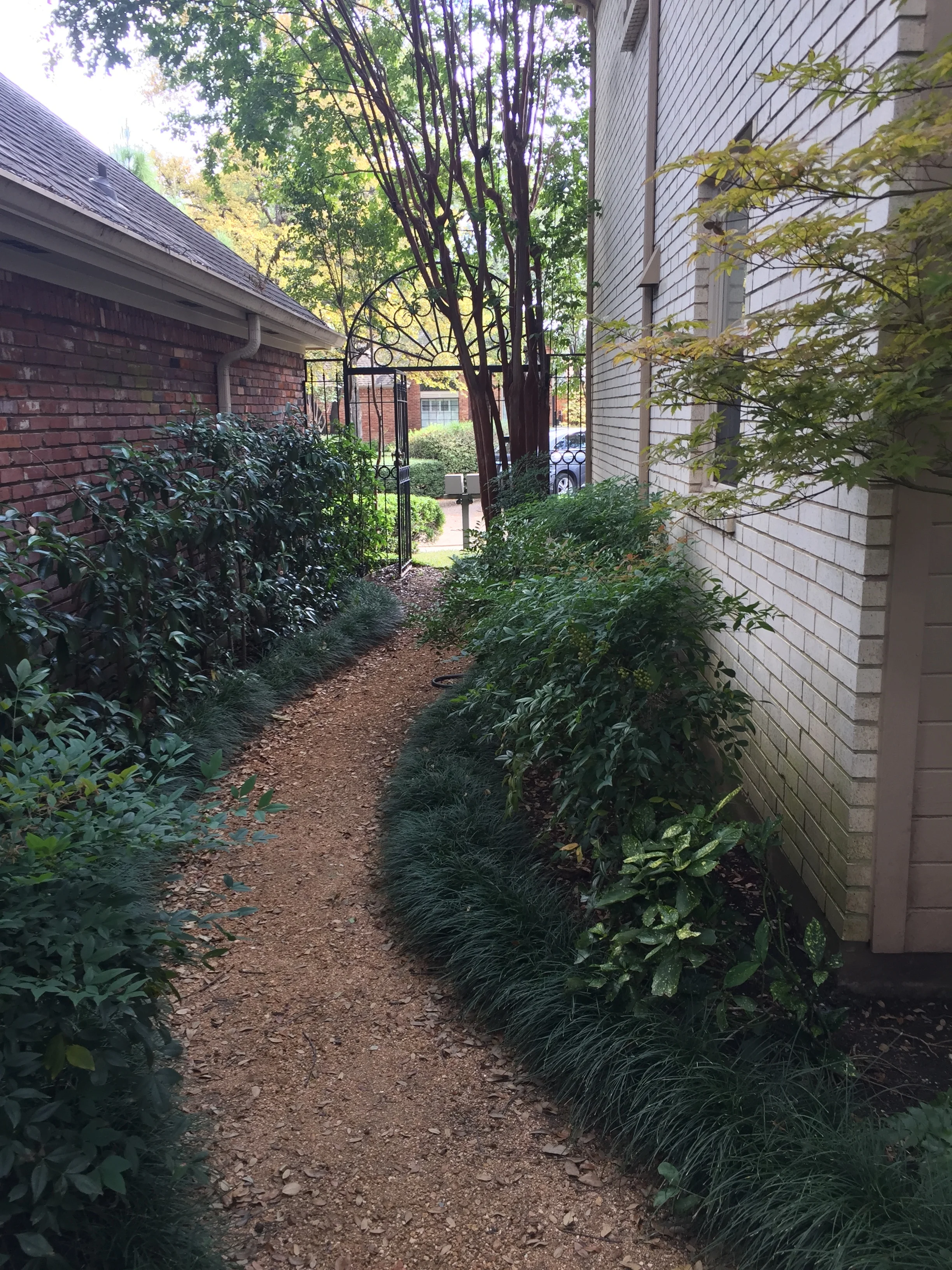 This couple loves to be outside with family and friends. We did a much larger patio for more seating. The biggest challenge was a very large Live Oak that blocked access to the back garden from the kitchen garden. This is the most frequently use entrance to the house (and the grilling area). Plantings were done to give privacy and reduce the view of high lighting power lines.